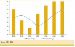 De overheid zou een beleid kunnen/moeten ontwikkelen dat gericht is op behoud van de bouwproductie en de werkgelegenheid. Dat kan door gedeeltelijk de consumentenvraag over te nemen, door het ondersteunen van de renovatiebouw en door investeringen in de utiliteitsbouw en infrastructuur.Als de overheid niet instapt, dan kunnen de gevolgen dramatisch zijn. Zo is becijferd dat dan de totale bouwproductie in 2020 met 7% zal dalen en dat die klap in 2021 nog iets zwaarder kan zijn. Als de economie herstelt in 2021, dan kan de Bouw in de jaren 2022 – 2024 een deel van het verlies weer goed maken. Desondanks dreigt alweer een periode van grotere schaarste als de crisis eenmaal is overwonnen. Het Economisch Instituut voor de Bouw verwacht dat de vergunningverlening dit jaar zal dalen van 57.000 woningen in 2019 naar 48.000 woningen in 2020 (zie figuur 1). In 2021 is een lichte verbetering mogelijk naar 65.000. Dat is echter te weinig om aan de structurele vraag in de markt van pakweg 75.000 woningen te voldoen. In 2021 zullen er ongeveer 50.000 woningen aan de voorraad toegevoegd worden. In 2024 kan dat getal opgelopen zijn naar 70.000 en dat is nog steeds te weinig om aan de vraag te voldoen. Dat voorspelt weinig goeds voor de prijsontwikkeling in de jaren na de crisis!