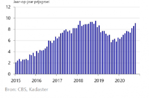 Je hoeft geen profeet te zijn om te voorzien dat in 2021 het verschil tussen vraag en aanbod alleen maar verder zal oplopen. Op de markt overheerst immers nog steeds het adagium eerst kopen dan pas verkopen. Die attitude is niet ze vreemd, omdat in Nederland de nieuwbouw stokt als gevolg van de stikstofcrisis.Het gevolg van deze trend is, dat in het lopende jaar, maar ook volgend jaar het aantal transacties gaat afnemen. Er zijn simpelweg te weinig huizen. Dat laatste feit zorgt ervoor dat de prijzen omhoog blijven gaan. De schaarste wordt immers steeds groter.Het goedbedoelde beleid van de Nederlandse overheid zorgt nog eens voor extra druk op de prijzen. Huizenkopers jonger dan 35 jaar hoeven in 2021 geen overdrachtsbelasting meer te betalen. Zodoende stijgt de koopkracht van deze groep. Bovendien heeft het kabinet de hypotheeknormen voor tweeverdieners verruimd, evenals voor Nederlanders met een studieschuld.. Het is tenslotte niet ondenkbaar dat ook in 2021 de hypotheekrente licht blijft dalen. Kortom, de aspirant koper heeft meer biedingskracht op een markt waar tekorten domineren. Dat moet prijzen wel omhoog jagen.Alleen een omslag in de economie kan voor een tempering van de stijging zorgen. Als de economie stagneert, dan zal de werkloosheid gaan oplopen. Dat zal in eerste instantie de jongeren in de flexibele schil treffen. Voor deze groep zal een eigen woning dan nog onbereikbaarder worden dan nu al het geval is. Huurprijzen zijn al hoog en hebben de neiging verder te stijgen. Op de markt voor koopwoningen heerst meer en meer een biedingenstrijd en daarmee heerst het recht van de sterkste. Zodoende kunnen sociale spanningen en tegenstellingen in Nederland in 2021 en verder verscherpen. Daar zit niemand op te wachten.