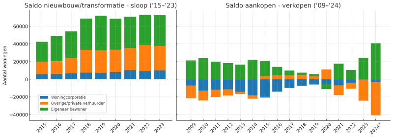 Toen in 2021 de overdrachtsbelasting voor beleggers werd verhoogd begonnen ook private beleggers steeds meer woningen te verkopen. Over de periode 2009 – 2024 verdwenen netto 250.000 huurwoningen uit handen van corporaties en private beleggers.