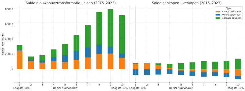 Beleggers investeerden niet alleen in nieuwbouw, maar ook door koopwoningen in het lage segment op te kopen. In de periode 2015-2023 ging het netto om ruim 20.000 woningen. Dat compenseerde deels de verkoop door corporaties in datzelfde segment. Omdat in de hogere segmenten zowel beleggers als corporaties verkochten, kochten beleggers in deze periode netto geen woningen. Wel leidde het proces van koop en verkoop per saldo tot een goedkopere private huurvoorraad.