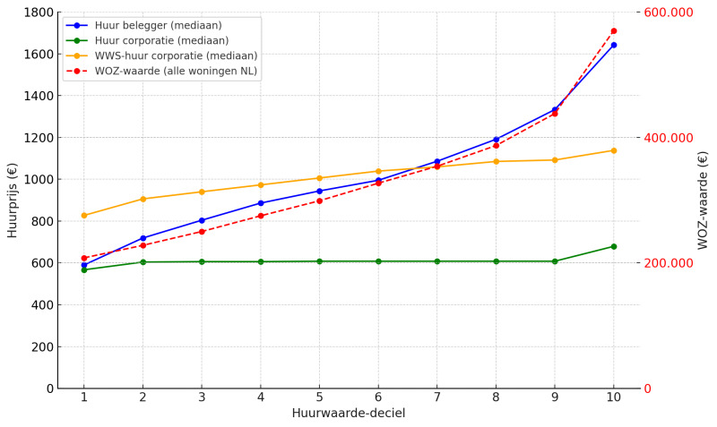 Figuur 3 op de volgende pagina laat zien dat huurprijzen van beleggerswoningen en de WOZ-waarden van alle woningen in Nederland, sterk toenemen van lage naar hogere segmenten. Dat ligt ook in de lijn der verwachtingen. Voor de doorsnee huurder van een corporatiewoning stijgt de huur amper. Door passend toewijzen en inkomensafhankelijke huurverlagingen in 2021 en 2023 is het inkomen steeds meer leidend geworden voor de huurprijs en niet de kwaliteit van de woning.